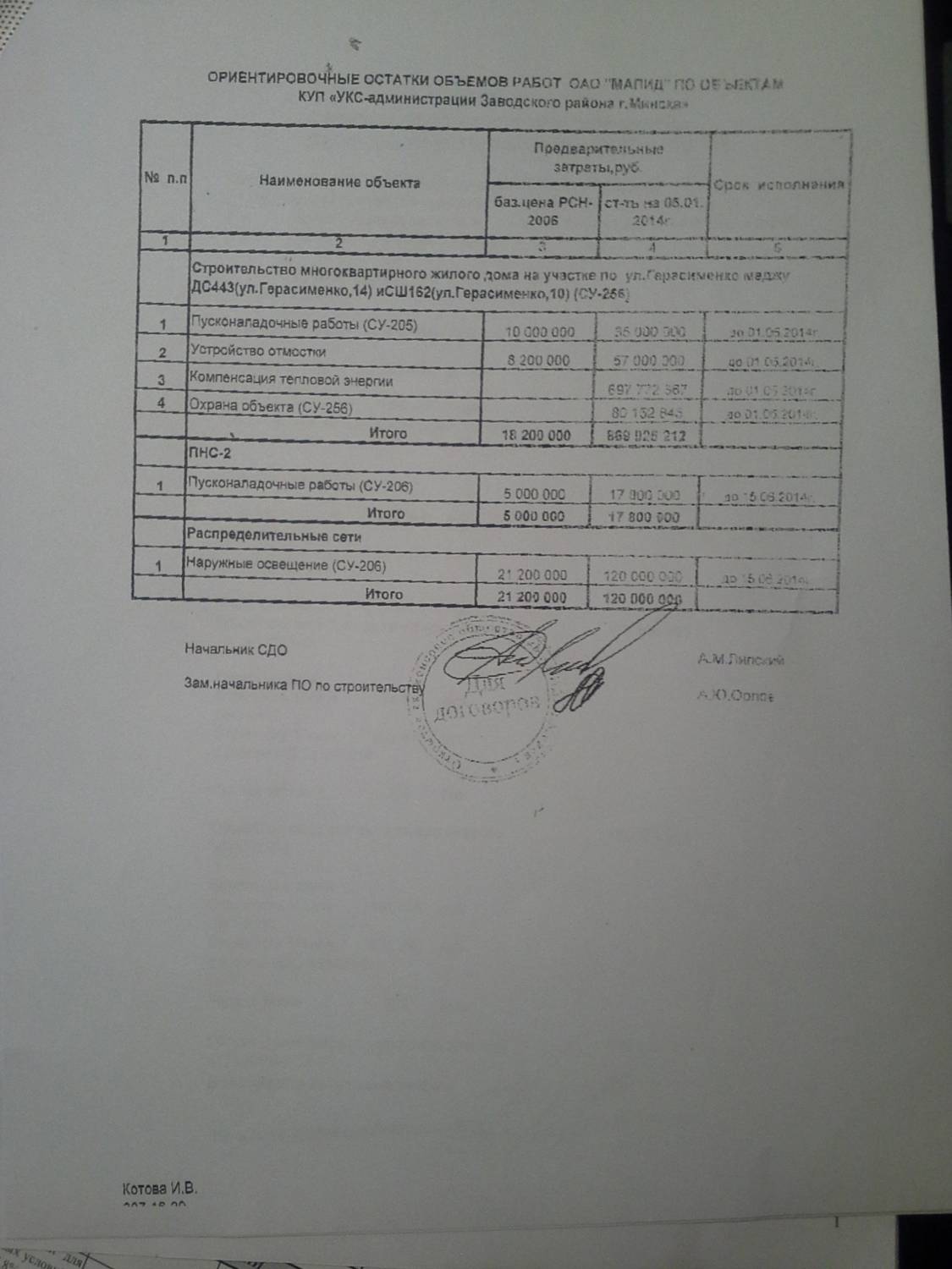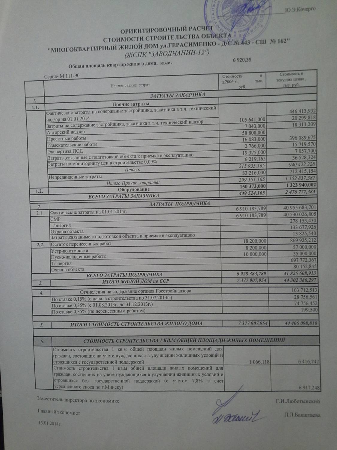 Добавлено (15.01.2014, 02:36) --------------------------------------------- Уважаемые жильцы!Краткая информация о ходе дел по состоянию на 14.01.2013 года. 10 января 2014 года получено заключение Госстройнадзора о приемке объекта в эксплуатацию. Акт приемки объекта, законченного строительством утверждается решением Мингорисполкома втечение 2-х недель после получения заключения Госстройнадзора, которое является ключевым документом. В связи с приемкой объекта в эксплуатацию начинаем с февраля 2013 года производить полностью платежи (основой долг и проценты) по льготным кредитам и кредитам за счет ресурсов банка. В январе платежи по кредитам (кроме процентов по кредиту за счет ресурсов банка) производить не нужно. Основание-приказ о приемке объекта в эксплуатацию будет январем 2014, платежи по кредитам начинаем производить с месяца, следующего за месяцем приемки объекта в эксплуатацию. Приказ о приемке объекта будет предоставлен в ф-л №511, ЦБУ№524, ф-л №527, ф-л №500. О том, какие документы и когда необходимо предоставлять многодетным семьям для получения финансовой помощи в погашение кредита, сообщу дополнительно. Срок заселения будет определен решением Мингорисполкома. Теперь по финансовойчасти. Фактические затраты по строительству дома в целом составили 40 955 683 701 руб.,остаток работ, перенесенных на благоприятный период-869 925 212 руб., затраты Заказчика (в т.ч. закупленное оборудование)-2 476 777 384 руб.Стоимость жилого дома составила 44 406 098 810 руб. Исходя из общей площади дома 6920,35 кв.м., стоимость квадратного метра для граждан, строящихся с господдержкой, составила 6416742 руб., для граждан, строящихся без господдержки (с учетом 7,8% в счет усредненного сноса)-6917248 руб. Расчет стоимости квадратного метра 15 января будет в банке и после его проверки и утверждения в банк будут предоставлены справки для увеличения кредитной линии исходя из нового расчета стоимости квадратного метра. Расчет стоимости квадратного метра, ориентировочные суммы по перенесенным остаткам работ, размещены на сайте в разделе "каталог файлов" и ниже. С уважением, Председатель правления